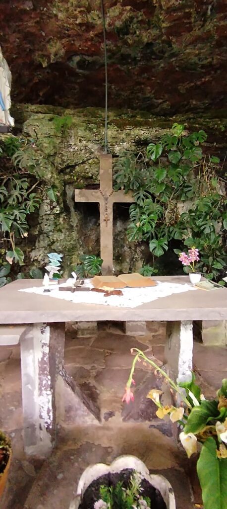 Al descender los visitantes son sorprendidos por una importante explanada de basalto, que cobija la capilla y una pequeña imagen de Nuestra Señora de Lourdes. Este lugar cuyo entorno natural que invita a la introspección y brinda una paz inmensurable, celebra misas cada segundo domingo del mes.